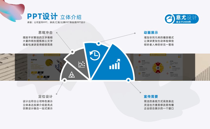蘇州意尤文化傳播有限公司是一家有著多年廣告設(shè)計(jì)經(jīng)驗(yàn)的蘇州知名廣告企業(yè) 主要業(yè)務(wù)有蘇州PPT設(shè)計(jì)、蘇州產(chǎn)品PPT設(shè)計(jì)、蘇州企業(yè)PPT設(shè)計(jì)、蘇州會(huì)議PPT設(shè)計(jì)、蘇州項(xiàng)目PPT設(shè)計(jì)、企業(yè)VI設(shè)計(jì)、設(shè)計(jì)印刷宣傳冊/樣本/單頁/名片等 自2007年成立以來,蘇州意尤廣告公司與蘇州及蘇州各市的幾百家中外企業(yè)進(jìn)行了廣告設(shè)計(jì)合作,經(jīng)過多年發(fā)展公司已形成了以企業(yè)PPT設(shè)計(jì)、企業(yè)VI設(shè)計(jì),廣告設(shè)計(jì),廣告印刷,樣本設(shè)計(jì),宣傳冊設(shè)計(jì),名片印刷,菜譜制作,單頁,宣傳單等一批特長業(yè)務(wù),相信在各位新老客戶的關(guān)心下,本公司會(huì)得到更大的發(fā)展,同時(shí)為客戶的發(fā)展宣傳保駕護(hù)航。